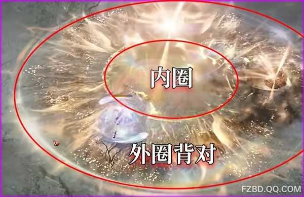 BOSS瞬移后出现在玩家附近出现一个两层的光圈,站在外层光圈背对BOSS即可
