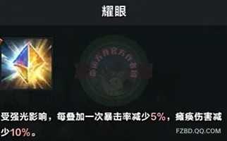 每次受到BOSS攻击,都会叠加一层耀眼DEBUFF,降低玩家暴击率5%,并减少10%瘫痪伤害可以通过净化符文减少层数,但如果叠满四层净化是解不开的,会受到失明效果,屏幕笼罩圣光(物理)持续15秒,在失明过程中再次受到伤害时间会重置到15秒