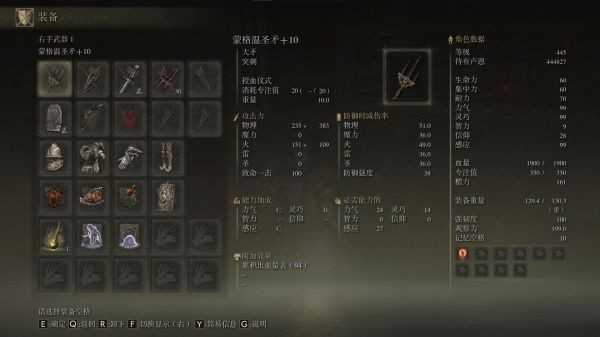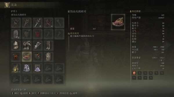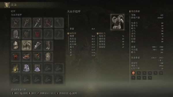 防御方面最后也是最重要的是护甲的选择。最强的是大山羊套,有着超高的减伤率和韧性(以便我们释放战技不被打断打死)下位替代有拉塔恩套、老将套、失乡骑士套等等重甲。思路就是在不过重的情况下(保持在重没关系),尽可能提升减伤率和韧性。