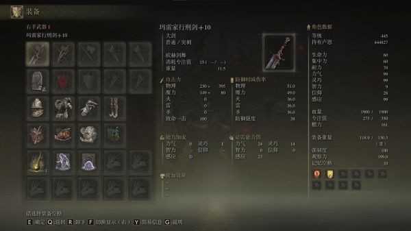 下面我们来弥补弱点,出血流在高周目才会难打的是高血量不吃出血的怪,比如艾尔登之兽,处理方式非常简单,我们选择一把同样是吃力敏感补正的武器:玛雷家行刑剑。无需洗点,改成这套装备,火露滴换成魔力露滴,一个3.5s的战技能打出上万的伤害。