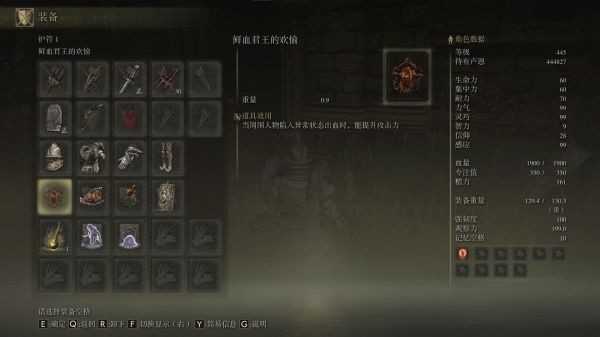鲜血君王的欢愉可以说是出血流的核心护符,效果是我方或敌方受到出血效果时,增加玩家20%全伤。大幅度的伤害加成和简单的触发条件使玩家战斗时几乎全程能吃到增幅。那么能否在进场前触发Buff呢?利用战灰切腹即可,效果为扣除一点点血量,直接在自己身上触发出血,这一点点伤害可以忽略不计,而且战斗全程不需要再重新续杯了。