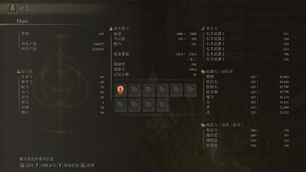 我们首先从圣矛的伤害构成切入。圣矛的主要输出手段是战技,战技造成的伤害包括其本身的物火混伤和怪出血量表满后受到的出血百分比伤害,因此我们配装的时候可以试图增加物理伤害、火焰伤害、战技伤害以及出血效率。由这张图可以看出满练度无Buff的出血矛物理面板为618,火伤面板为260,而状态页面显示的面板为911。