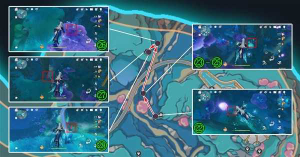 23-25、海底小道附近的球形植物上方,三个挑战为一个挑战桩。挑战为收集指定数量的微粒。