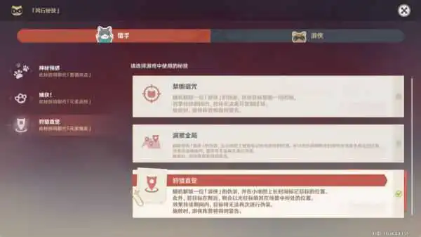 猎手的普通攻击位置有两种秘技选择,其一为感应光环,cd较短,可小范围探测,若探测有游侠隐匿,则会有感叹号警示。其二为神秘预感,会有箭头短暂标示所有游侠方向,cd较长(45秒)。