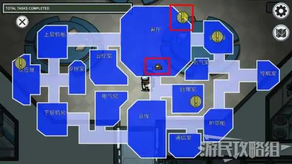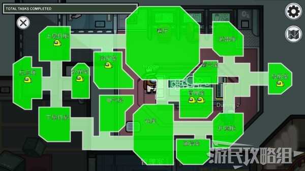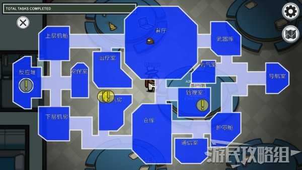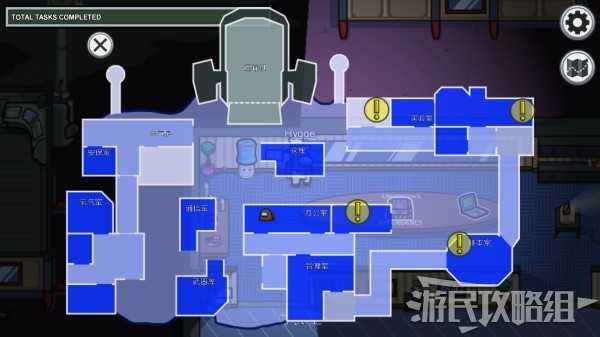 右上角为设置按钮和地图功能,地图中的头像代表玩家当前所在位置,叹号则表示好人玩家能够进行的任务位置。