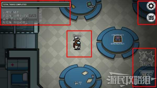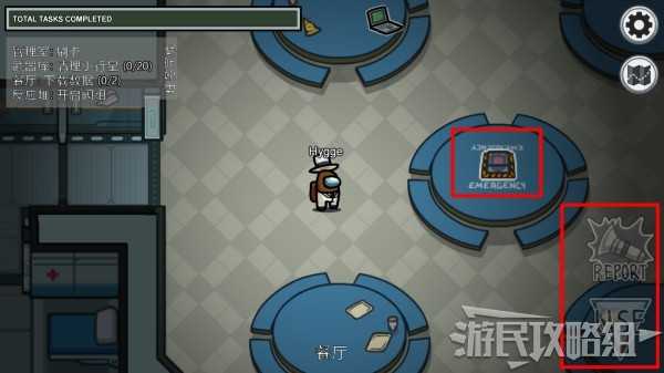右下角为当前玩家可以进行的操作,好人只能够使用互动完成任务,或者在看见尸体后发动警报。在并没发现尸体但好人识别出内鬼后,可以与房间中央的紧急按钮互动发起会议。
