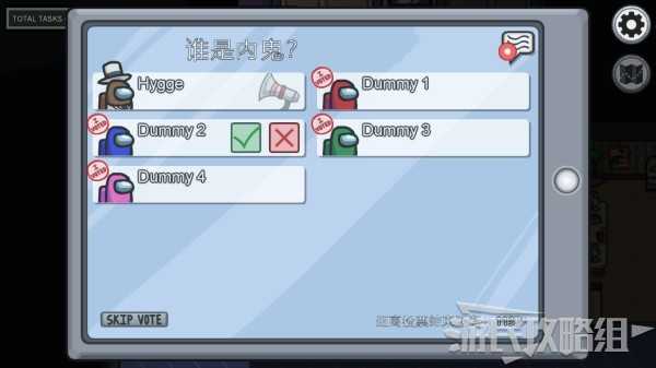 在紧急会议界面玩家可以通过语音或者打字交流,选出大家都认为是内鬼的玩家,该玩家头像后对勾确认投票。全部玩家投票或弃票后结算,获得票数最多的玩家会被驱逐离开本局比赛,当所有的内鬼被驱逐出去后好人胜利游戏结束。