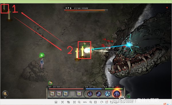 看图4,触手技能结束以后,从1号位子移动到2号位子近距离输出何罗鱼,看到脚底有红圈施放风身法躲过红圈和激光。