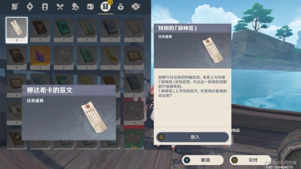 在房子后面的船上,劝说她回去继续当巫女,劝说无果后,把【特别的御神签】交给她,对话完就完成任务了,并获的新的道具【柳达希卡的签文】
