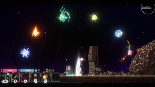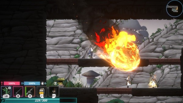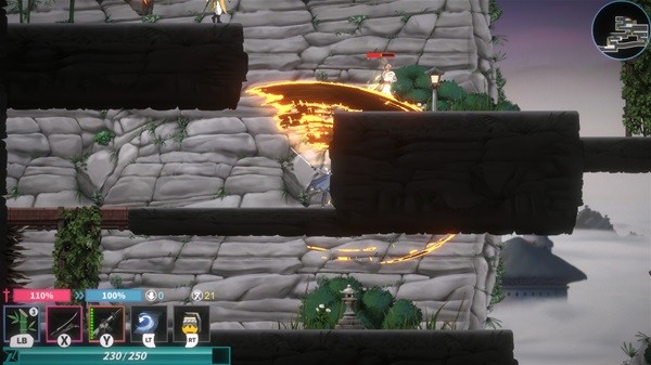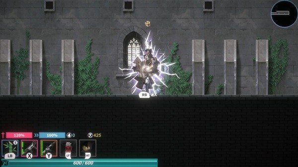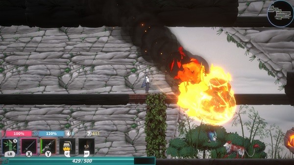 于是杀敌回血+CD减半+全远程武器组合(近战武器也可以换掉了),《回溯勇者》的无脑包爽组合就出现了:一般的横版动作游戏中,往往是在跳台上或者敌人的的距离上做文章,不过我们上面这套组合,可以用豪火球之术从三楼打二楼和一楼,我们的火箭炮可以在几个屏幕之外就把敌人清场,我们还有手榴弹作为敌人万一近身之后的保险底牌。就单纯的丢伤害,就可以轻松灌死各个BOSS也说明了这一套打法的IMBA,最短一个BOSS甚至也就撑了半分钟。