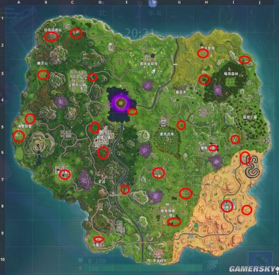 裂缝可以重新进入跳伞状态,转移较快,而且在裂缝附近都有着宝箱和地面战利品的刷新点。先上目前全图裂缝刷新点: