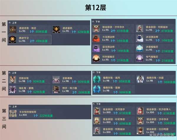 12层这些怪的血量,每一场怪血量都是几百万,让人看得血压狂飙,全部加起来高达一千五百万,可惜了不是RNB。每一个版本都有三期深渊,怪物都不变,血量也不变,只是给的BUFF不一样。