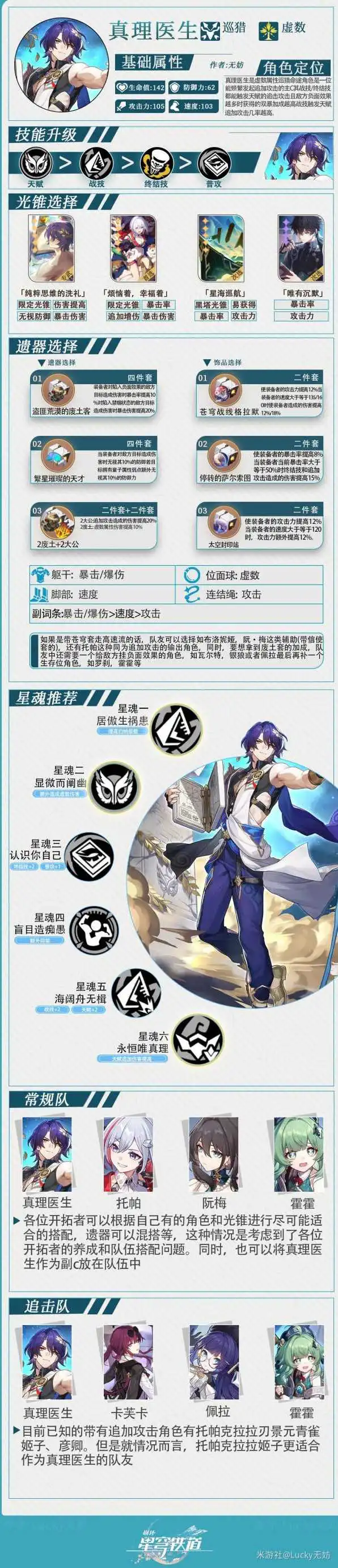 《崩坏星穹铁道》真理医生是即将登场的虚数巡猎,他有着对单体的高额伤害,想要知道真理医生如何培养的玩家请看下面“Lucky无妨”带来的《崩坏星穹铁道》真理医生一图流攻略,希望能够帮助大家。