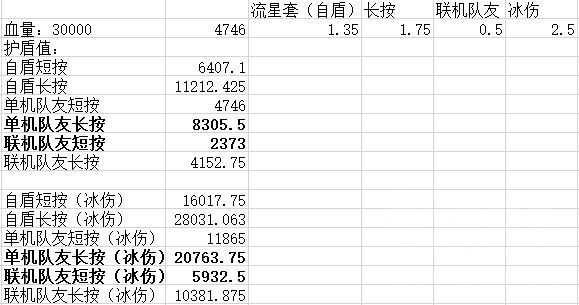 护盾值=(生命值23558*0.101+1097)*流星套护盾强效1.35*二命1.15*长按1.75*联机队友衰减0.5*冰吸收加成2.5