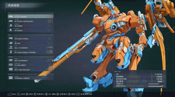 右手选择大型号的线性步枪的最主要原因是第一冲击力超级高并且弹速非常快,命中率奇高无比,有的时候甚至就只是平常一发蓄力射击就能精准命中,同时蓄力一发几乎可以稳定把绝大多数机体打入踉跄状态,进而切入月光剑冈钉的输出循环,而且蓄力可以稳定清理各种大型杂兵,双足机体杂兵基本上就是两发,其它小型无人机基本上就是一发,弹容量为10发,配合月光剑完完全全足以用最快的速度清理一整波杂兵。