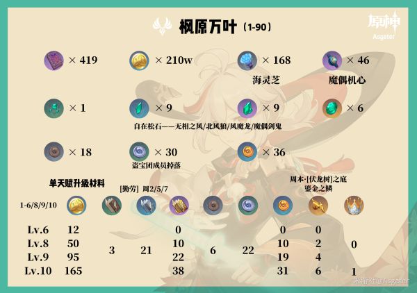 枫原万叶池子已经开启,这是一名5星风属性角色,那么他有什么特点,要怎么培养,请看下面由“Asgater”带来的《原神》1.6版枫原万叶培养一图流,一起来看看吧。