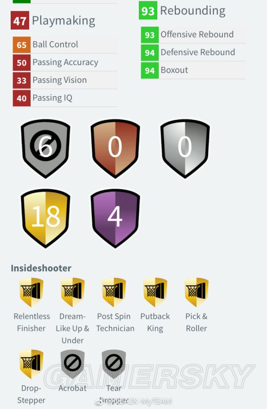 优缺点明显,一方面:游戏里最优质的模型之一,94空位三分,内线终结能力上乘;另一方面:被刻意大幅削弱的传球属性、仅仅71的横移、70的力量以及先天偏少的紫徽章数量。自带4个紫徽章:接球投篮、挡拆投篮手、远距离神射手和坚韧得分手。