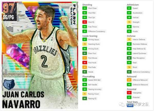 有“炸弹”之称的纳瓦罗,这是他首次在2K21中亮相,而且这还是一张银河【故障卡】。属性方面,三分95,突扣更是高达98,还有97的三速以及出色的运球包,紫章也多达32枚,在目前的小个控卫(1米91)中可以占有一席之地,算是一张不错的【故障卡】。