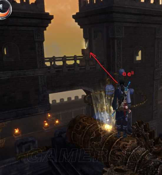 这个位置相信研究过跳跳乐的筒子们都印象深刻,到达图中位置之前的路已经是蜀道一般的存在了,而这个点虽然与目标地点一木之隔,但却是隔座大山一般的艰难,稍有不慎掉到下面去便只能绕一大圈重新来过。而箭头所指位置便是可利用跳跃的凸起位置,此时要做的是先正对挡路的障碍木桩按住前方向键,角色会处于原地踏步状态,这时用鼠标控制方向渐渐转向外侧,很快你会发现角色走到了木桩的侧面并开始下坠,这时你保持足够机敏的反应速度做两件事,一是按住前进键的同时迅速调整面向,二是按下跳跃键。如果面向能调整到偏向悬崖一侧20度角,便会借助凸起部分跳到喵星人位置对面的木台上,然后便可轻松回跳逮到喵星人。当然这里也有另一种跳法就是面向迅速调整至偏向悬崖一侧大概70度角,这时跳起来应该会撞到面前的柱子而只在凸起位置平移了一小段距离,这时需要保持这个而向继续按跳跃,直至滑过障碍木桩正好落在喵星人的位置,这里一定要冷静,稍一冲动多按了一下空格(这时你肯定还是按着方向键的),然后角色便会跳下木台落到下层,笔者出现过一次这种的失误,当时面前仿佛浮现出两行字“胜败乃兵家常事,大侠请重新来过”…………TOT………………以上两种跳法都是运用了悬空跳跃的技巧,很多喵星人似乎不掌握这个技巧是无法找到的,笔者现在只记得天晴之海和衡道众外围也需要这样的技巧,再就是落日部的大石头,当时没研究明白跳那个手都要断了……