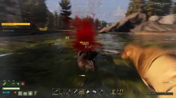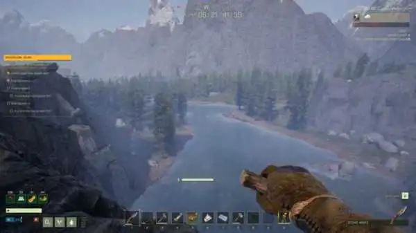 然后向北走,注意附近可能冒出来的掠食者,河谷中应该会出现不少狼和熊。但如上文所述,跳进水里就可以处理掉掠食者。杀死动物后,烹饪生肉,同时在周围采集一些制作布护甲所需的纤维。