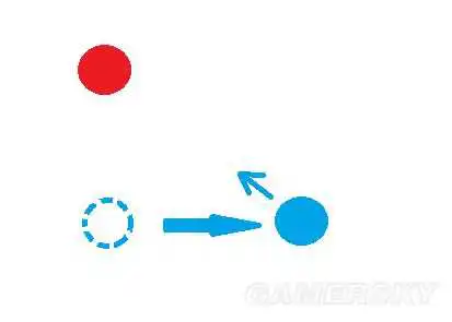 红色代表敌人,蓝色代表自己,当垫步后的相对位置是图一时,会使出一般的垫步攻击。如同在未锁定状态下推L3按X翻滚后接R1的攻击方式。