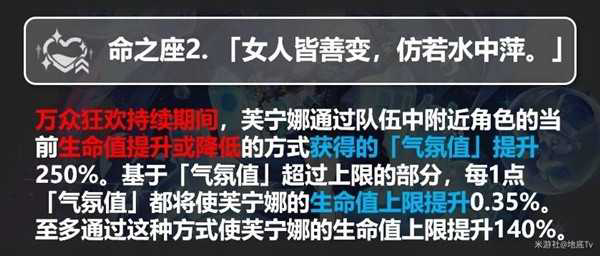 2命(关键命座):大幅提升「气氛值」获取效率和生命值上限。在配合一位群奶时,大招平均提高增伤提升至90%左右,平均生命加成在90%左右。