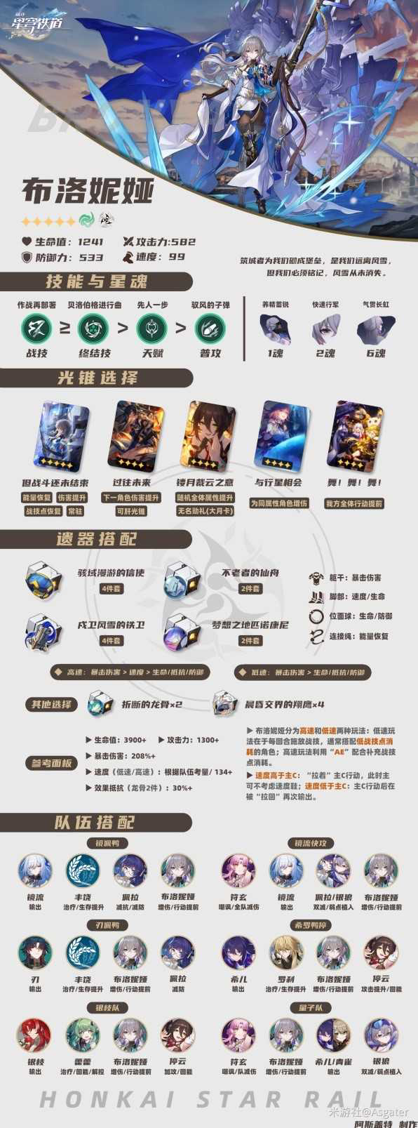 ⑥【队伍搭配】布洛妮娅的配队十分多样,自身兼具增伤、拉条、暴伤提升、攻击提升等多种增益手段使得可以辅助当前大部分的输出角色,如镜流(镜佩鸭、符镜狼)、刃(刃佩鸭)、希儿(配合布洛妮娅战技多动)等。