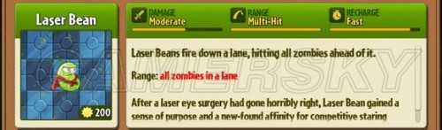 激光豆射击一条线路,击中所有在前进的僵尸。