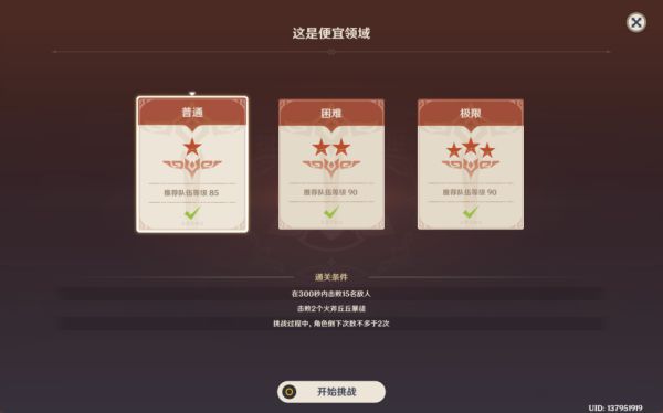 1.每个挑战共有三个难度,完成高难度挑战,较低难度挑战将自动完成。每个难度的挑战都有三个通关条件,必须全部达成才视作通关。