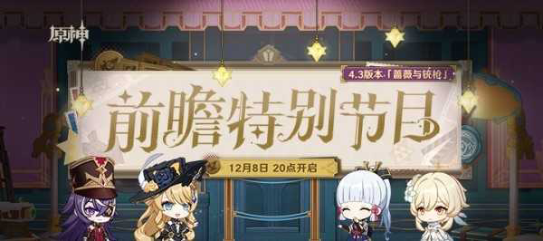 《原神》4.3版本「蔷薇与铳枪」前瞻特别节目将于12月8日(周五)晚20:00正式开启。本次特别节目将在B站直播间、斗鱼直播间、虎牙直播间、快手直播间、抖音直播间等直播间同步开播。本次特别节目将为大家带来4.3版本的更新内容,直播间内还有兑换码等福利“掉落”。