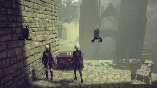 位置: 在一周目结尾的废弃工厂底层某个箱子中获得。乘坐电梯下楼后继续前进,途中会遇到几个和烙饼一样的飞行机器人,之后你能在到达下图所示的位置,此时向左跳过几个飞行机器人后即可发现箱子。