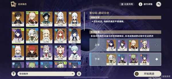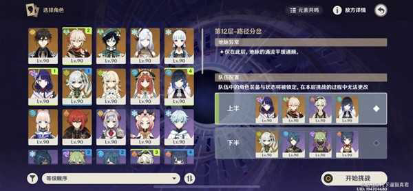 上半还有一队,就是绫华永冻队,12-1上半,看似有个冰骗骗花不好打,其实对绫华永冻没啥影响,12-2的草鸡,12-3的水草圣骸兽,都对永冻没有影响,可以说整个12层上半都没有恶意针对永冻的原魔,甚至深渊祝福加成绫华还能吃到。