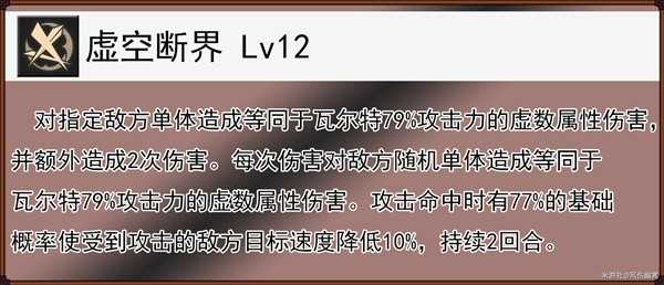 瓦尔特是单体减速跟群体控的功能,大大改善战斗环境。有一定的输出能力,就看你选择躯干选择暴击爆伤还是效果命中了,是非常推荐的一个角色。
