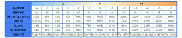 第二世代至第四世代命中修正均为百分数,下表为精确值。第五世代起,计算方法为通常的 0 级时视作 3⁄3,每提高 1 级分子 +1,每降低 1 级分母 +1,下表中提供了近似百分数值。