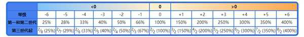 第一和第二世代中,能力变化的修正均为百分数,下表为精确值。第三世代起,计算方法为通常的 0 级时视作 2⁄2,每提高 1 级分子 +1,每降低 1 级分母 +1,下表中提供了近似百分数值。