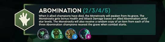 当有3名友方英雄死亡时,憎恶(暂译)会从墓地苏醒。憎恶的生命值和攻击力会从[丧尸]英雄的星级中受益。憎恶会从每个距离墓碑最近的[丧尸]英雄中随机复制一件装备(每个英雄一件,最多三件)。
