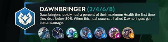 [黎明使者]会在生命值首次低于50%时迅速回复一定百分比的最大生命值。当回复效果生效时,所有友军会造成10%额外伤害。