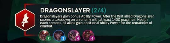 [屠龙勇士]获得额外法强。在第一个[屠龙勇士]参与击杀一个至少有1400生命值的敌人后,所有友军会获得额外法强,持续至战斗结束。