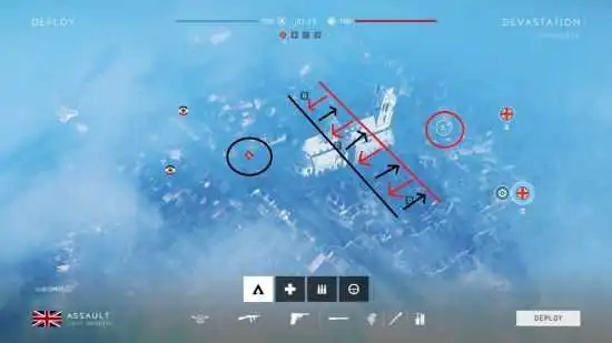 至于要怎么占点才比较有利呢?其实毁灭地图的各占领点间并没有很明显的优势,像是地势很高地势很低、掩护多掩护少、建筑物多建筑物少……等等,不似纳尔维克的 BD 桥梁或鹿特丹 D 点,因此家园点跟中间的 C 点一定要抢下,至于要拿 B 或 D 都不会有太大的差异。
