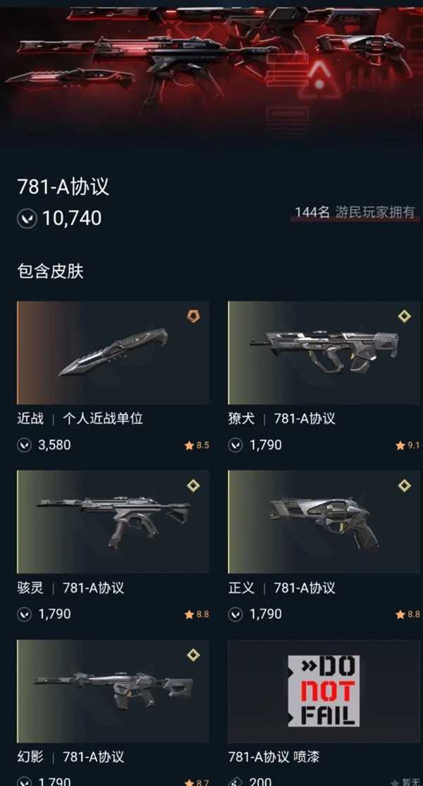 套装包含3个喷漆,3个卡面和3个挂饰,喷漆单买200VP,卡面单买250VP,挂饰单买300VP