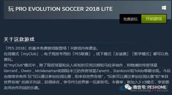 Konami在PS Store和steam等平台推出了《实况足球2018Lite》。本作为《实况足球2018》的基本免费版,并支持游玩完整版中的『My Club』,『PES League』和『友谊赛』与『教学模式』。『友谊赛』模式中玩家所能选择的球队有限。除此之外,线上对战模式的『PES League』所能玩到的比赛也将有一定的限制,具体的限制内容并未详细说明。对于只喜欢玩MC模式的朋友来说,直接这个版本会非常划算。Myclub模式是近几年《实况足球》系列主推的在线模式,玩家可以通过游戏里的GP或是金币合成、抽取球员组建自己的队伍,并与线上的其它玩家进行对战。此外在11月16日《实况足球2018》会迎来一次比较大的更新,包含新的转会资料、新球场、新球鞋、新球员脸型等内容,而经典球员贝克汉姆也会出现在Myclub模式当中。