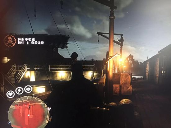 卡在船和陆地连接桥后的木桶的后面,确保左边码头的警察打不到你。