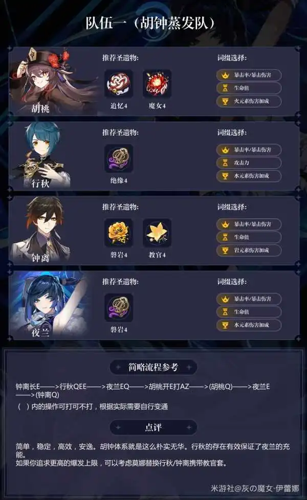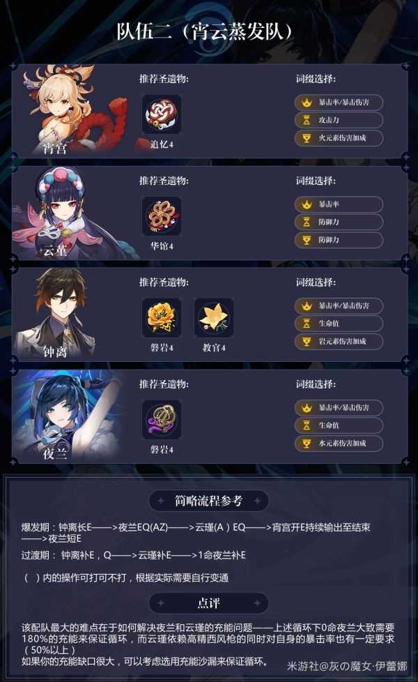 最大的特点是操作简单无脑,可以用来抬一些你喜欢的真爱角色。缺点也很明显,伤害一般,提升主要靠夜兰命座。此外,拆了3个T0(国家队,雷九,神鹤)队伍,成本不是一般得高。