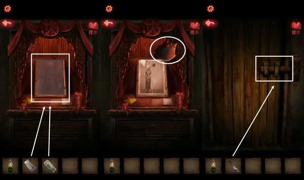 9、【煤油灯】在桌上的蜡烛点燃,进入房间。根据【反字日记】上的提示,调整架子上的物品,拿到【唱片】。架子上拿到【铅笔】,日记本往后翻页拿到【半张照片】。