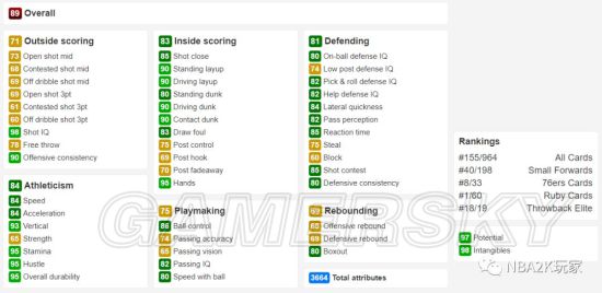 这张红宝石J博士的属性总值为3664,摘取了目前红宝石球员卡中的第一位(红宝石的J博士也还是有些牌面的);六大项中有三项绿区和三项黄区。