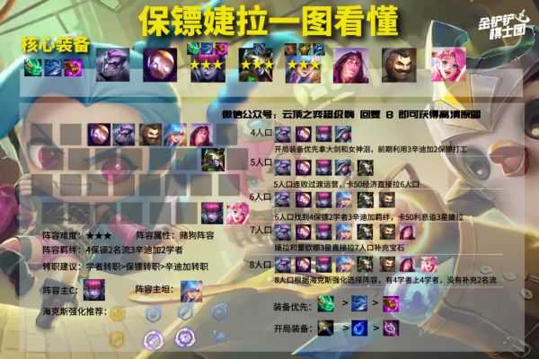 保镖婕拉是一套6人口赌婕拉的赌狗阵容,开局优先拿婕拉的装备,青龙刀是婕拉的核心输出装备,因此大剑和女神来都是可以拿的,但是大剑的优先级会更高一些,主要是大剑能够做出巨杀给婕拉使用,巨杀则是后期打3星英雄的关键装备。其他装备肉装可以给波比或者诺手打工都是非常不错的选择。