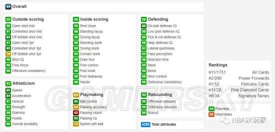 2012年的状元秀浓眉哥,这张粉钻卡目前在大前锋这个位置上总属性由于传球能力有限,稍逊于狼王加内特粉钻卡屈居第二。但是用过浓眉的朋友应该都了解,浓眉可能是由于233长臂展缘故,给人一种莫名好用的感觉,内线摘板很稳,外线出手也很舒服。属性数值上作为一名内线球员也都非常优秀,毕竟是99粉钻卡,堆也堆起来了。名人堂级的内线防守徽章如铜墙铁壁、精英篮板手等和唐斯一样也都一应俱全,投射徽章里中投、底角三分、高难度投篮为金色,接球投篮则上了名人堂,投篮热区的覆盖也非常广,这张粉钻浓眉对于喜欢有投射能力内线的玩家朋友们来说,和唐斯一样不容错过。