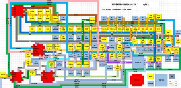运行没啥问题,就是布线的时候要仔细一点。红色的星际物流塔为基础,从左到右输出原材料,黄色的是制造台,蓝色都是小箱子,红色的箭头是爪子,每条转送带上门的材料都标注了。