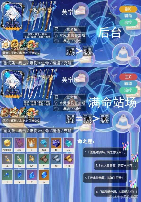 《原神》中的芙宁娜是一名水属性五星角色,那么芙宁娜适合什么位置,要怎么出装加点呢?请看下面由“风伤幽冥”带来的《原神》芙宁娜培养简要一图流,希望对大家有用。