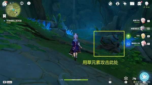 带上草种子用重击或者瞄准射击连续攻击两次如下图所示物件后,秘境就能成功解锁。